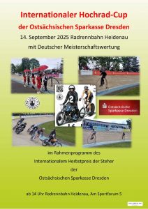 Frank Albert wird am 14.9.2025 im „Internationalen Hochrad Cup“ in Dresden teilnehmen. Falls Jemand in der Nähe ist oder Reiselust zu den beiden Events verspürt, würde sich Frank freuen.